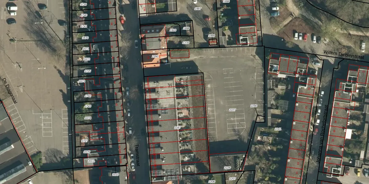 Het perceel waarop Tramstraat 21-43 staat heeft een oppervlakte van 1773 m². Dit is een zeer groot perceel. De perceeloppervlakte wordt geregistreerd door het Kadaster. Gedetailleerde informatie over de maten van dit perceel kunt u vinden in het rapport Kadastrale kaart met maatvoering van Tramstraat 21-43.