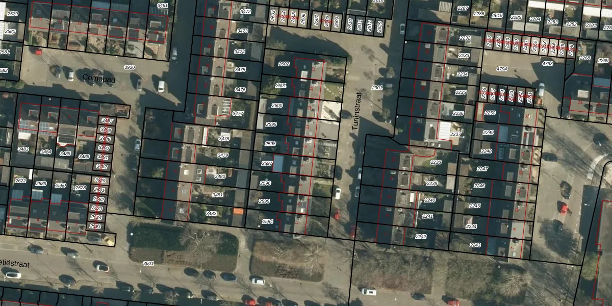 Turijnstraat 9 is gelegen op kadastraal perceel WSL01C2598. Deze kadastrale aanduiding is uniek en wordt gebruikt door het Kadaster om eigendomsrechten en andere zakelijke rechten vast te leggen. Het perceel maakt onderdeel uit van de kadastrale gemeente Woensel.