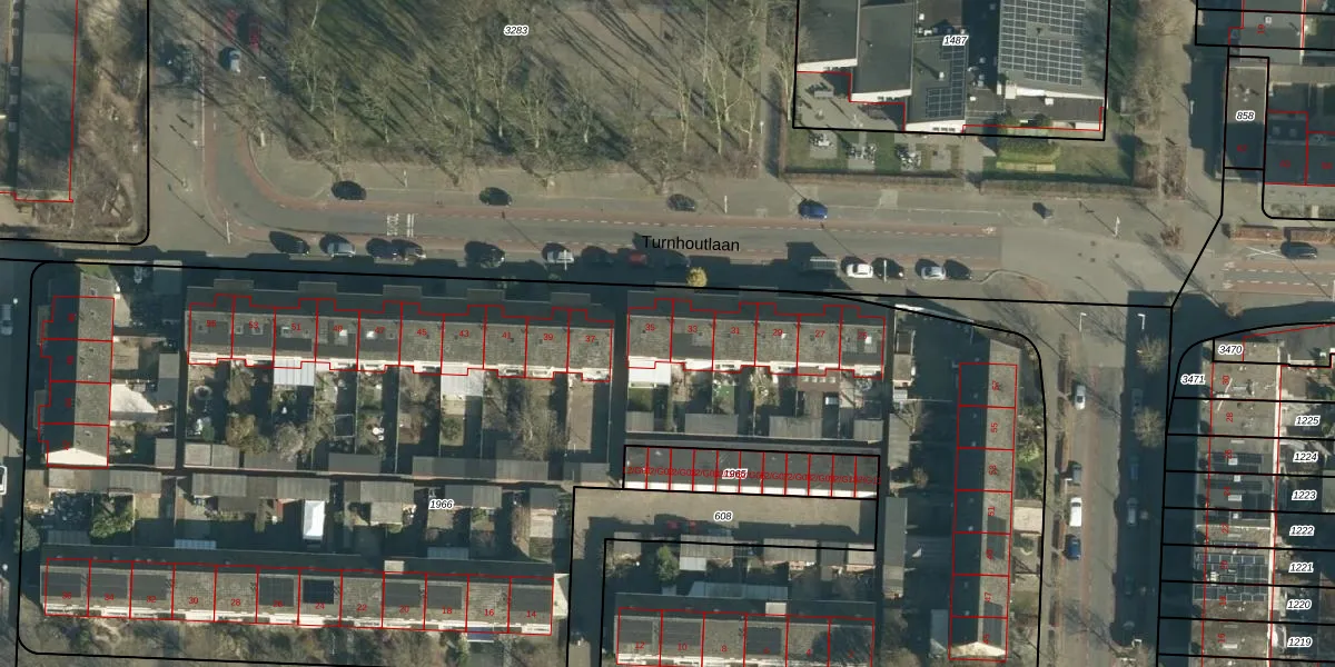 Het perceel waarop Turnhoutlaan 35 staat heeft een oppervlakte van 8187 m². Dit is een zeer groot perceel. De perceeloppervlakte wordt geregistreerd door het Kadaster. Gedetailleerde informatie over de maten van dit perceel kunt u vinden in het rapport Kadastrale kaart met maatvoering van Turnhoutlaan 35.