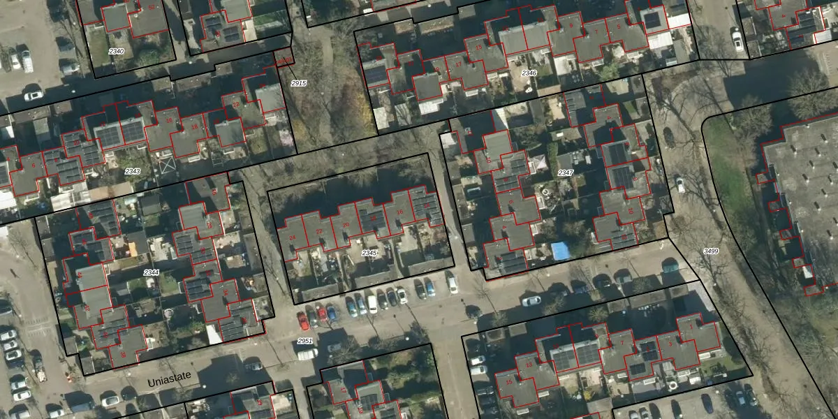 Het perceel waarop Uniastate 14 staat heeft een oppervlakte van 1094 m². Dit is een zeer groot perceel. De perceeloppervlakte wordt geregistreerd door het Kadaster. Gedetailleerde informatie over de maten van dit perceel kunt u vinden in het rapport Kadastrale kaart met maatvoering van Uniastate 14.