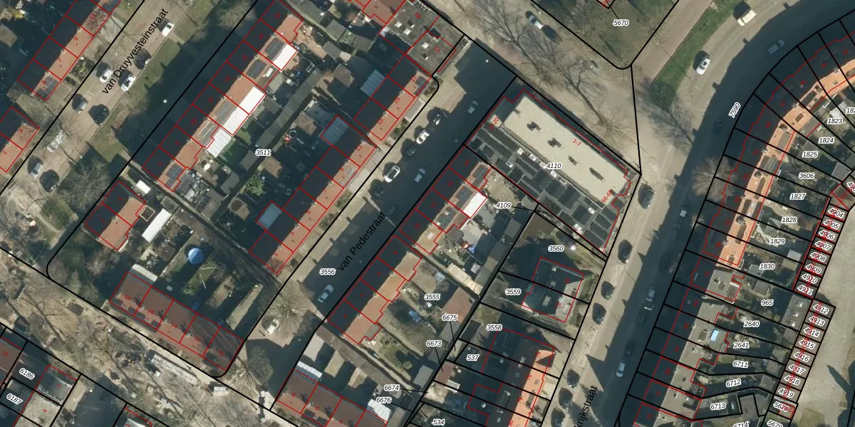 Het perceel waarop van Pedestraat 12 staat heeft een oppervlakte van 2037 m². Dit is een zeer groot perceel. De perceeloppervlakte wordt geregistreerd door het Kadaster. Gedetailleerde informatie over de maten van dit perceel kunt u vinden in het rapport Kadastrale kaart met maatvoering van van Pedestraat 12.
