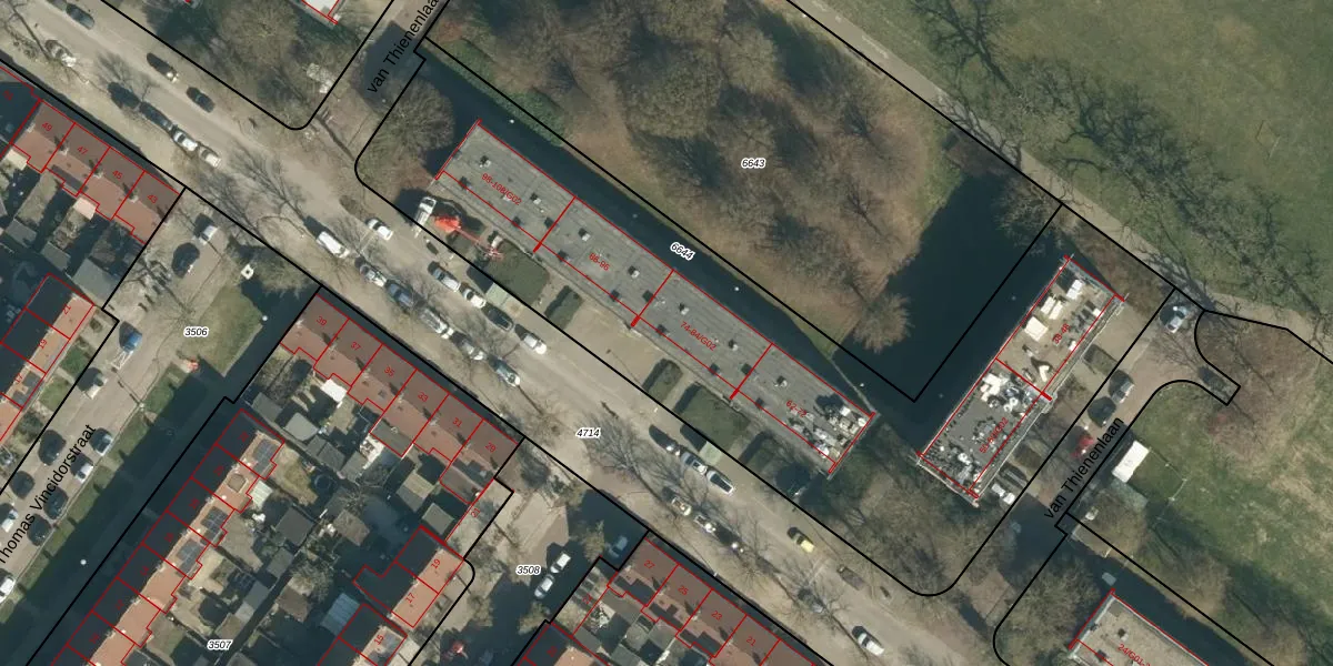 Het perceel waarop van Thienenlaan 82 staat heeft een oppervlakte van 3335 m². Dit is een zeer groot perceel. De perceeloppervlakte wordt geregistreerd door het Kadaster. Gedetailleerde informatie over de maten van dit perceel kunt u vinden in het rapport Kadastrale kaart met maatvoering van van Thienenlaan 82.