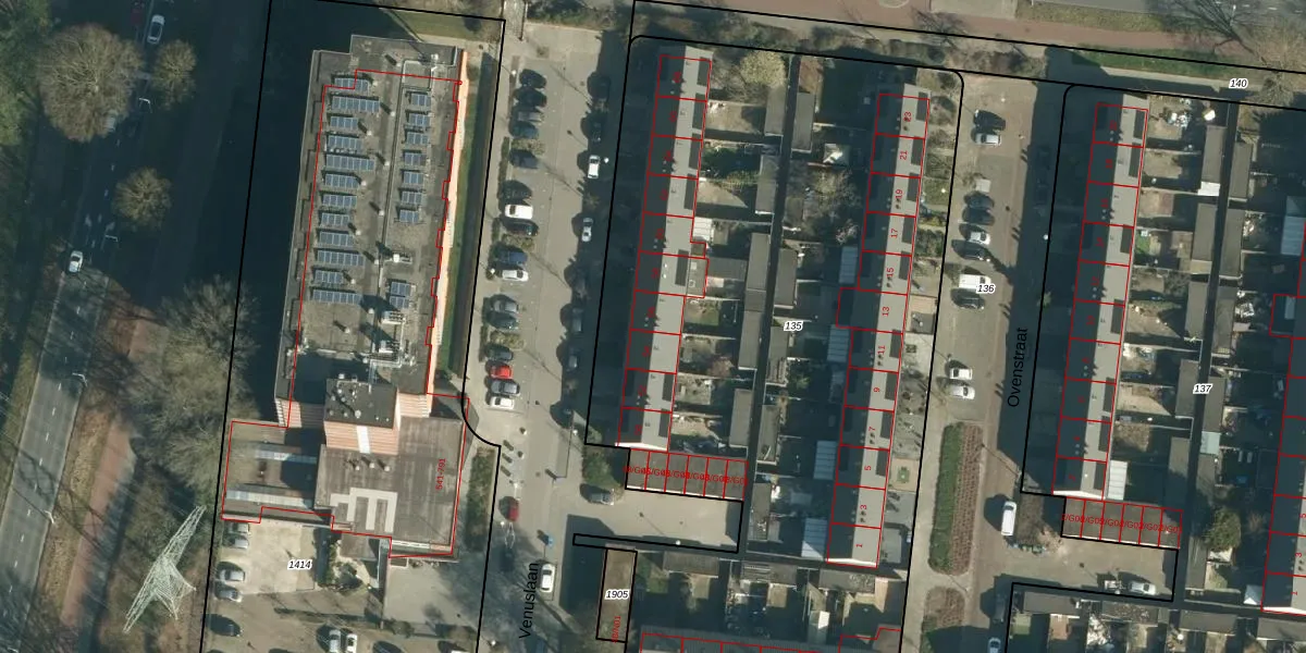 Het perceel waarop Venuslaan 56 staat heeft een oppervlakte van 4848 m². Dit is een zeer groot perceel. De perceeloppervlakte wordt geregistreerd door het Kadaster. Gedetailleerde informatie over de maten van dit perceel kunt u vinden in het rapport Kadastrale kaart met maatvoering van Venuslaan 56.