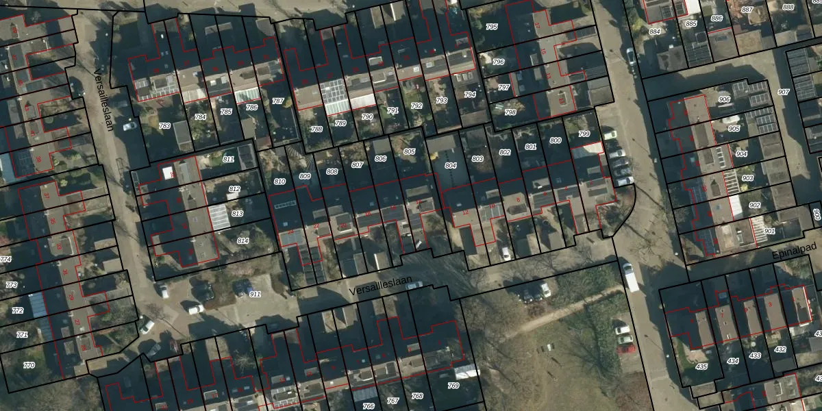Versailleslaan 14 is gelegen op kadastraal perceel WSL01S805. Deze kadastrale aanduiding is uniek en wordt gebruikt door het Kadaster om eigendomsrechten en andere zakelijke rechten vast te leggen. Het perceel maakt onderdeel uit van de kadastrale gemeente Woensel.