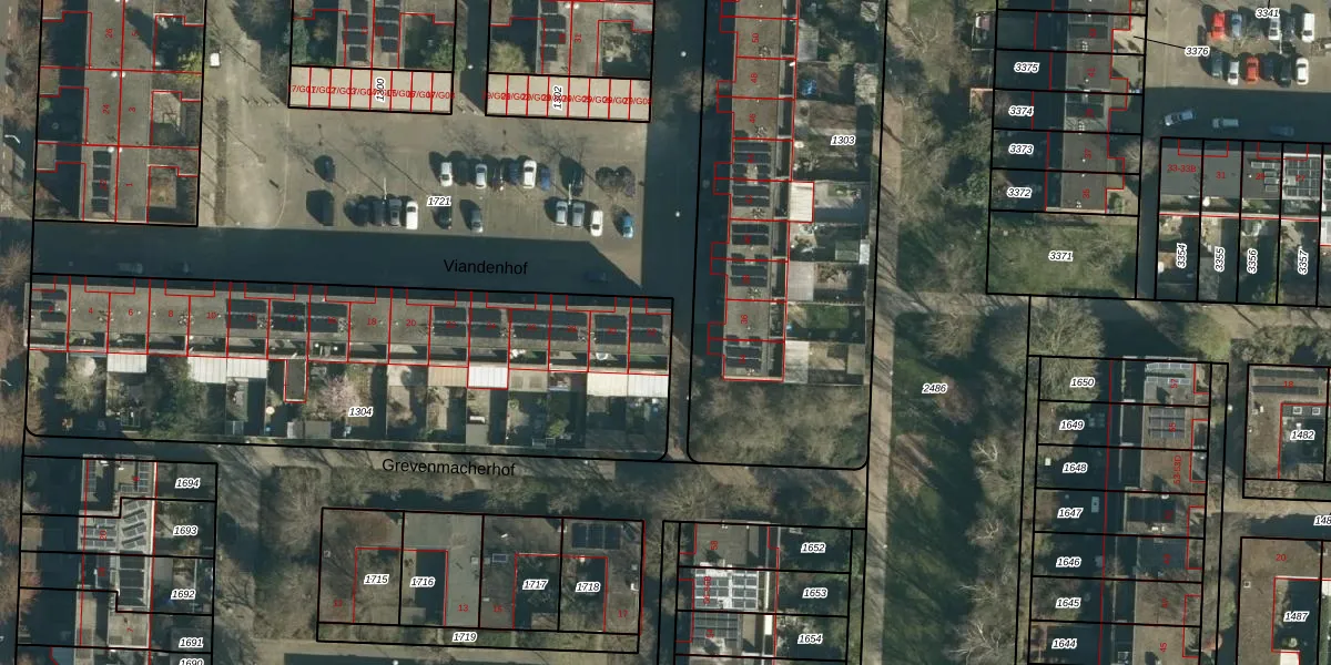 Het perceel waarop Viandenhof 32 staat heeft een oppervlakte van 2372 m². Dit is een zeer groot perceel. De perceeloppervlakte wordt geregistreerd door het Kadaster. Gedetailleerde informatie over de maten van dit perceel kunt u vinden in het rapport Kadastrale kaart met maatvoering van Viandenhof 32.