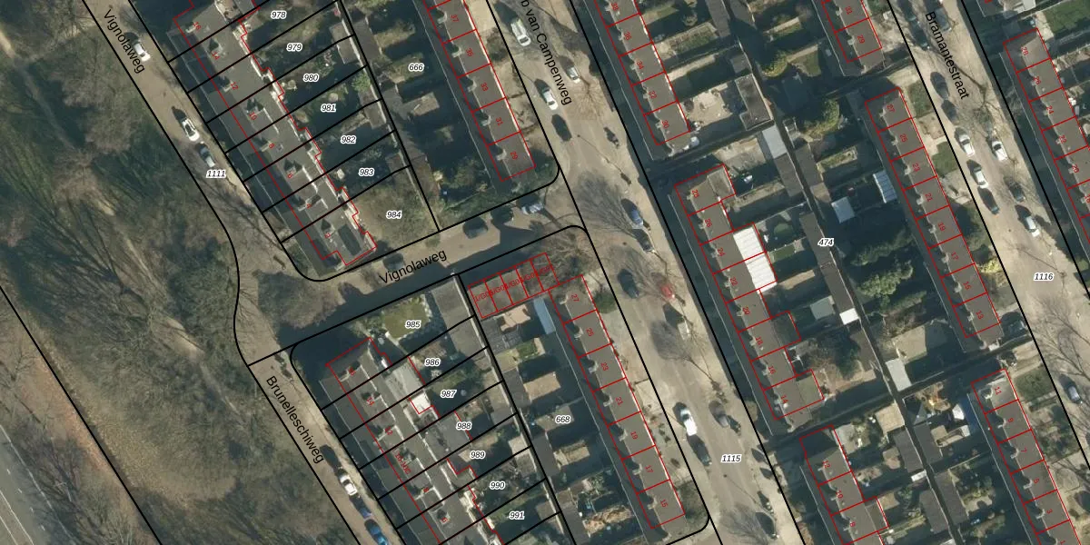 Het perceel waarop Vignolaweg 1-G01 staat heeft een oppervlakte van 1502 m². Dit is een zeer groot perceel. De perceeloppervlakte wordt geregistreerd door het Kadaster. Gedetailleerde informatie over de maten van dit perceel kunt u vinden in het rapport Kadastrale kaart met maatvoering van Vignolaweg 1-G01.