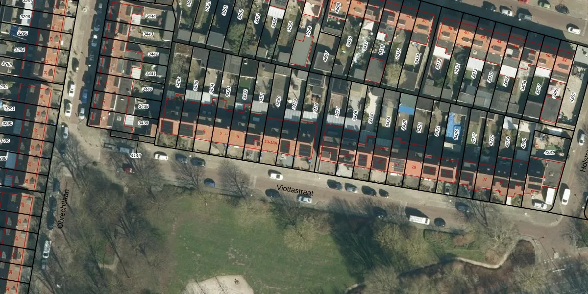 Het perceel waarop Viottastraat 15 staat heeft een oppervlakte van 194 m². Dit is een middelgroot perceel. De perceeloppervlakte wordt geregistreerd door het Kadaster. Gedetailleerde informatie over de maten van dit perceel kunt u vinden in het rapport Kadastrale kaart met maatvoering van Viottastraat 15.