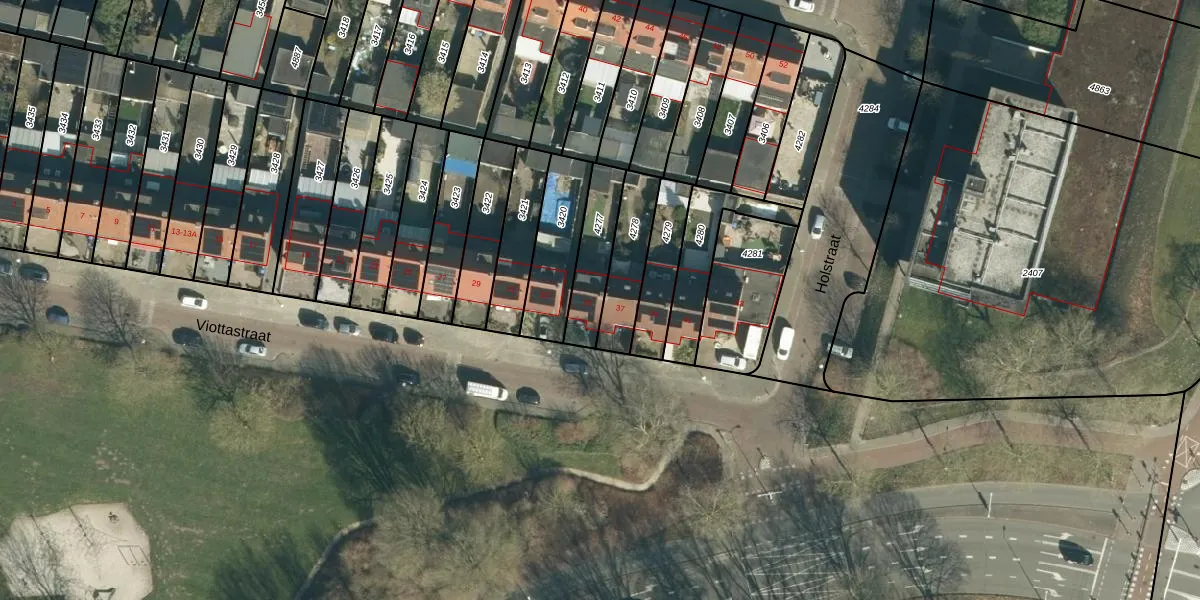 Gebruik de zoekbalk of klik op een perceel voor informatie over de adressen binnen dit perceel.