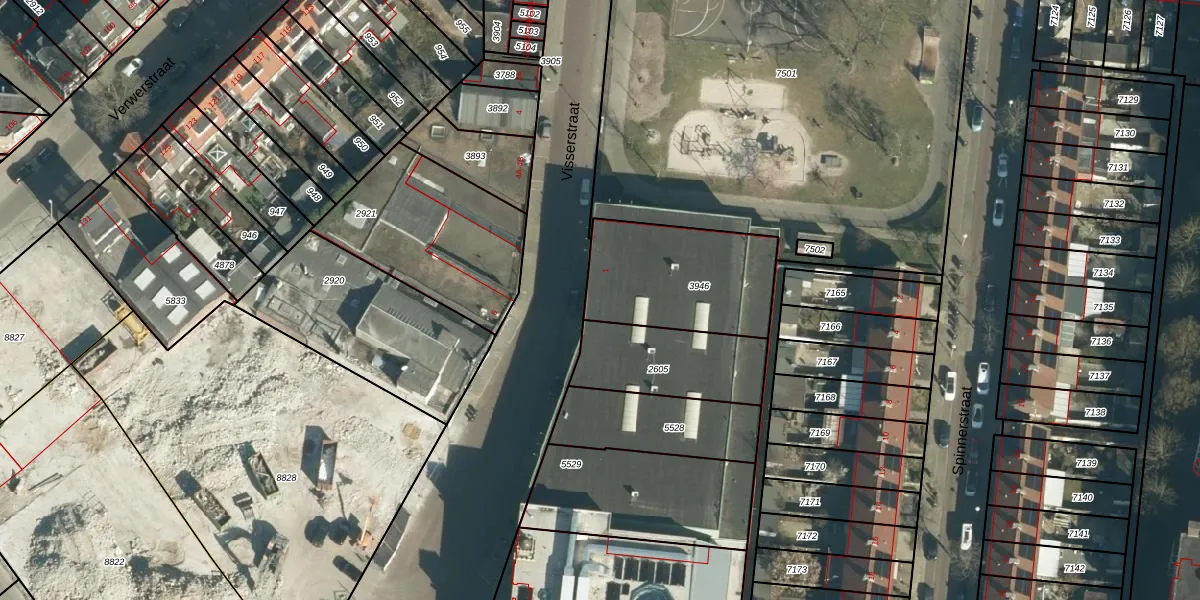 Het perceel waarop Visserstraat 1 staat heeft een oppervlakte van 523 m². Dit is een groot perceel. De perceeloppervlakte wordt geregistreerd door het Kadaster. Gedetailleerde informatie over de maten van dit perceel kunt u vinden in het rapport Kadastrale kaart met maatvoering van Visserstraat 1.