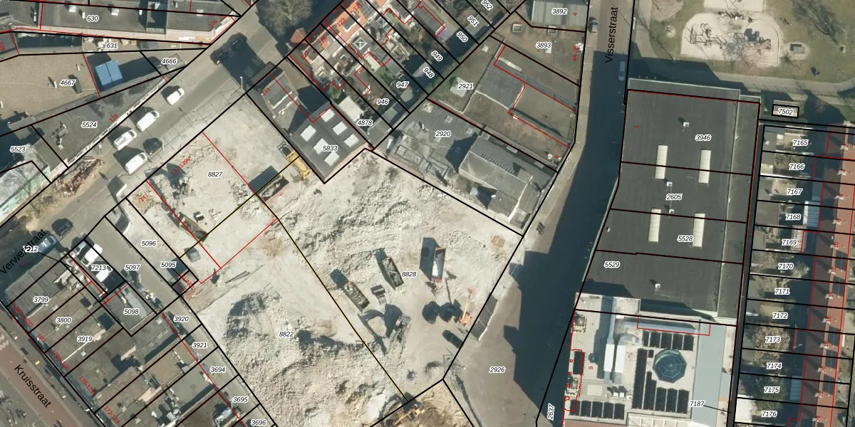 Het perceel waarop Visserstraat 10-19 staat heeft een oppervlakte van 1903 m². Dit is een zeer groot perceel. De perceeloppervlakte wordt geregistreerd door het Kadaster. Gedetailleerde informatie over de maten van dit perceel kunt u vinden in het rapport Kadastrale kaart met maatvoering van Visserstraat 10-19.