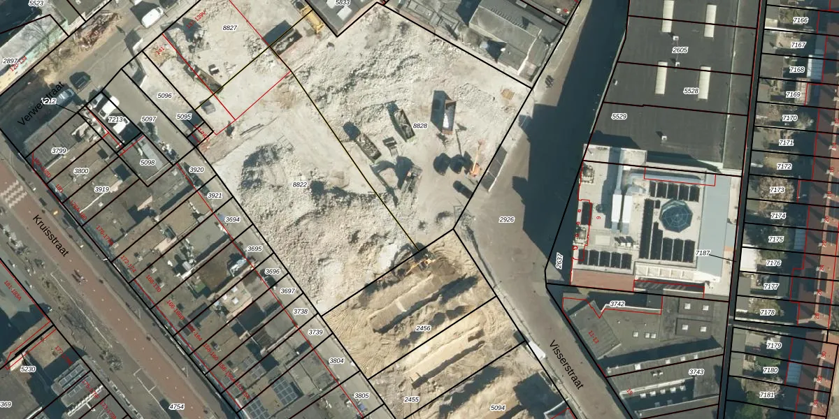 Het perceel waarop Visserstraat 12-C staat heeft een oppervlakte van 1903 m². Dit is een zeer groot perceel. De perceeloppervlakte wordt geregistreerd door het Kadaster. Gedetailleerde informatie over de maten van dit perceel kunt u vinden in het rapport Kadastrale kaart met maatvoering van Visserstraat 12-C.