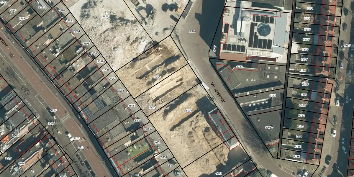 Het perceel waarop Visserstraat 14-42 staat heeft een oppervlakte van 464 m². Dit is een groot perceel. De perceeloppervlakte wordt geregistreerd door het Kadaster. Gedetailleerde informatie over de maten van dit perceel kunt u vinden in het rapport Kadastrale kaart met maatvoering van Visserstraat 14-42.