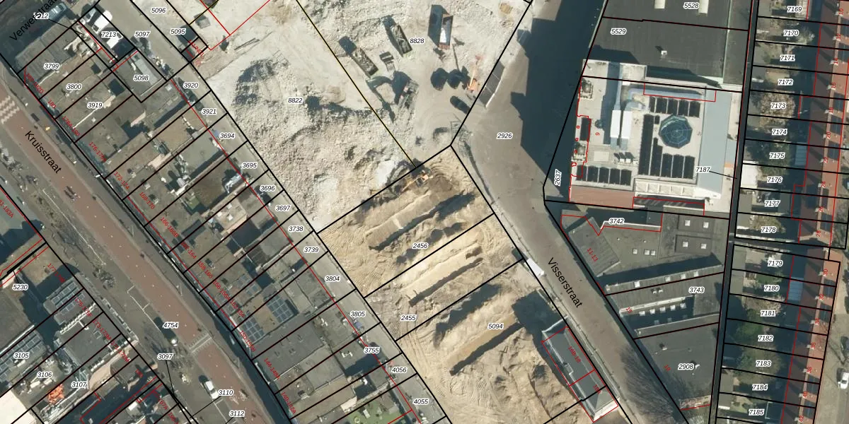 Het perceel waarop Visserstraat 14-49 staat heeft een oppervlakte van 707 m². Dit is een groot perceel. De perceeloppervlakte wordt geregistreerd door het Kadaster. Gedetailleerde informatie over de maten van dit perceel kunt u vinden in het rapport Kadastrale kaart met maatvoering van Visserstraat 14-49.