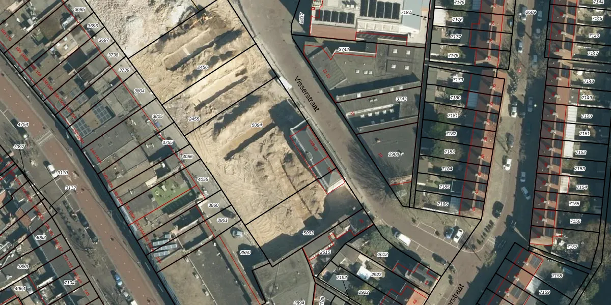 Het perceel waarop Visserstraat 16-B staat heeft een oppervlakte van 1263 m². Dit is een zeer groot perceel. De perceeloppervlakte wordt geregistreerd door het Kadaster. Gedetailleerde informatie over de maten van dit perceel kunt u vinden in het rapport Kadastrale kaart met maatvoering van Visserstraat 16-B.