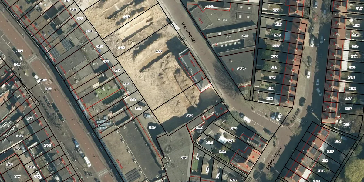 Het perceel waarop Visserstraat 16-A staat heeft een oppervlakte van 1263 m². Dit is een zeer groot perceel. De perceeloppervlakte wordt geregistreerd door het Kadaster. Gedetailleerde informatie over de maten van dit perceel kunt u vinden in het rapport Kadastrale kaart met maatvoering van Visserstraat 16-A.