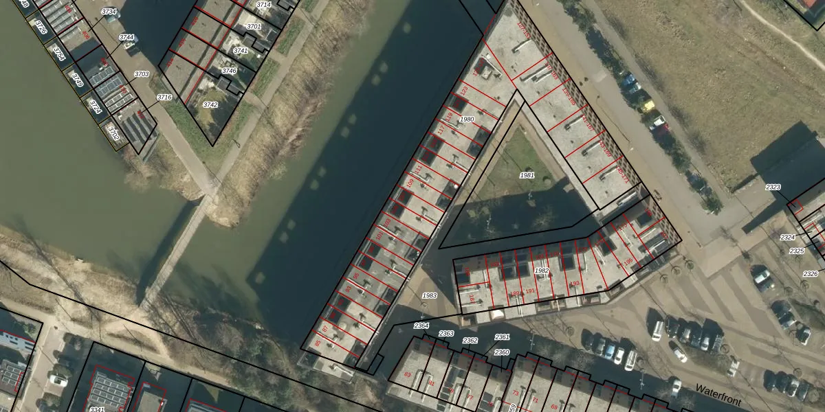 Het perceel waarop Waterfront 107 staat heeft een oppervlakte van 1963 m². Dit is een zeer groot perceel. De perceeloppervlakte wordt geregistreerd door het Kadaster. Gedetailleerde informatie over de maten van dit perceel kunt u vinden in het rapport Kadastrale kaart met maatvoering van Waterfront 107.