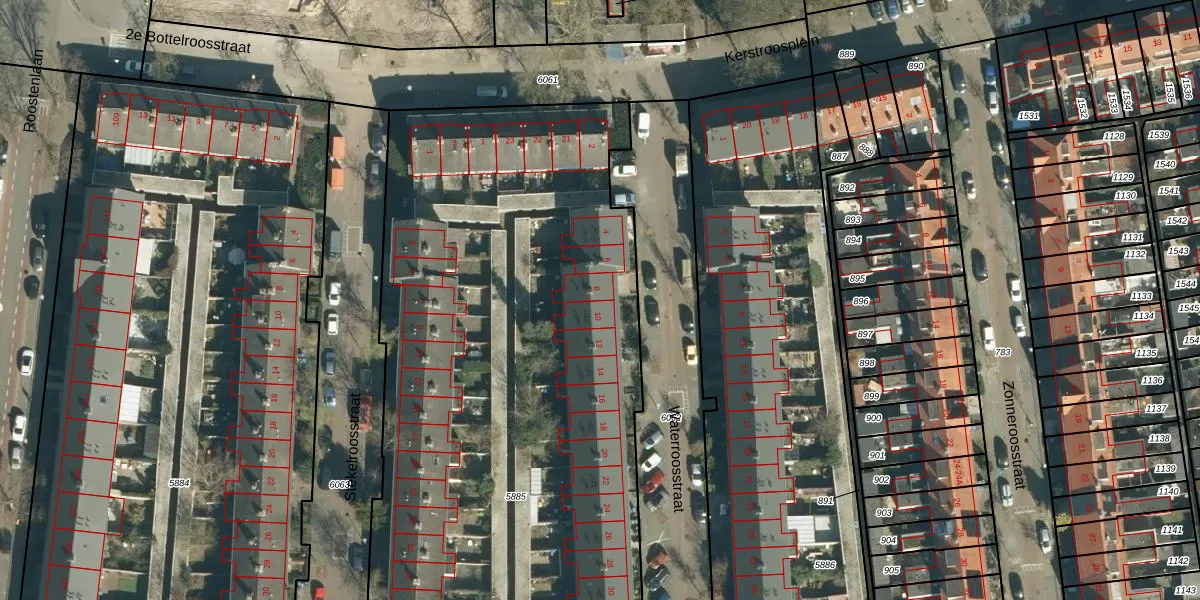 Het perceel waarop Waterroosstraat 8 staat heeft een oppervlakte van 6752 m². Dit is een zeer groot perceel. De perceeloppervlakte wordt geregistreerd door het Kadaster. Gedetailleerde informatie over de maten van dit perceel kunt u vinden in het rapport Kadastrale kaart met maatvoering van Waterroosstraat 8.