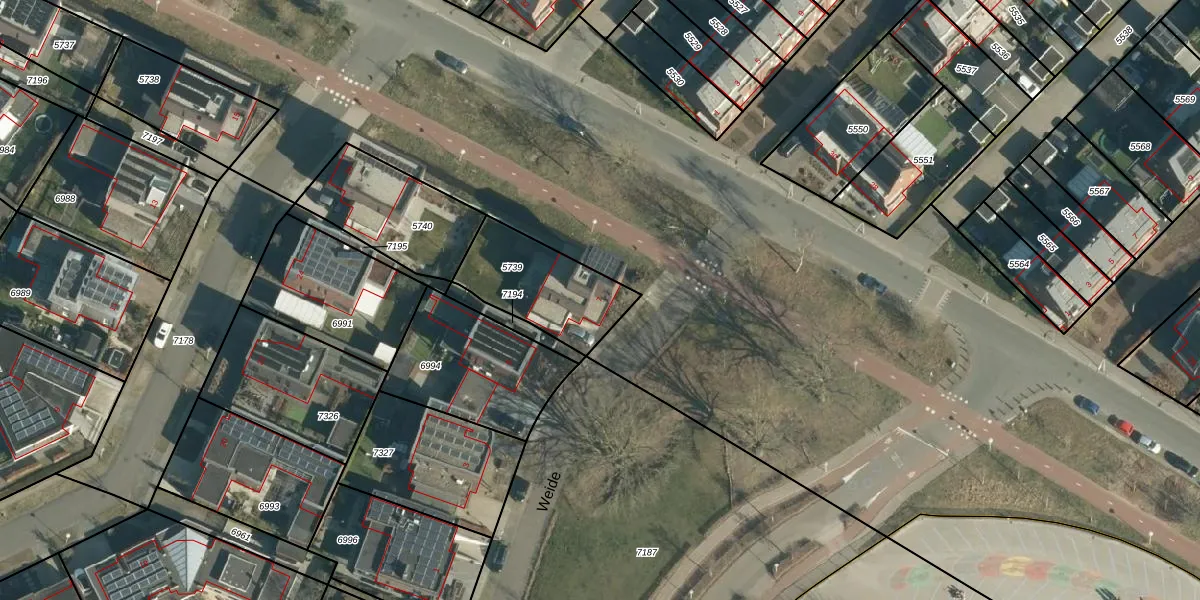 Weide 7 is gelegen op kadastraal perceel WSL01X5739. Deze kadastrale aanduiding is uniek en wordt gebruikt door het Kadaster om eigendomsrechten en andere zakelijke rechten vast te leggen. Het perceel maakt onderdeel uit van de kadastrale gemeente Woensel.