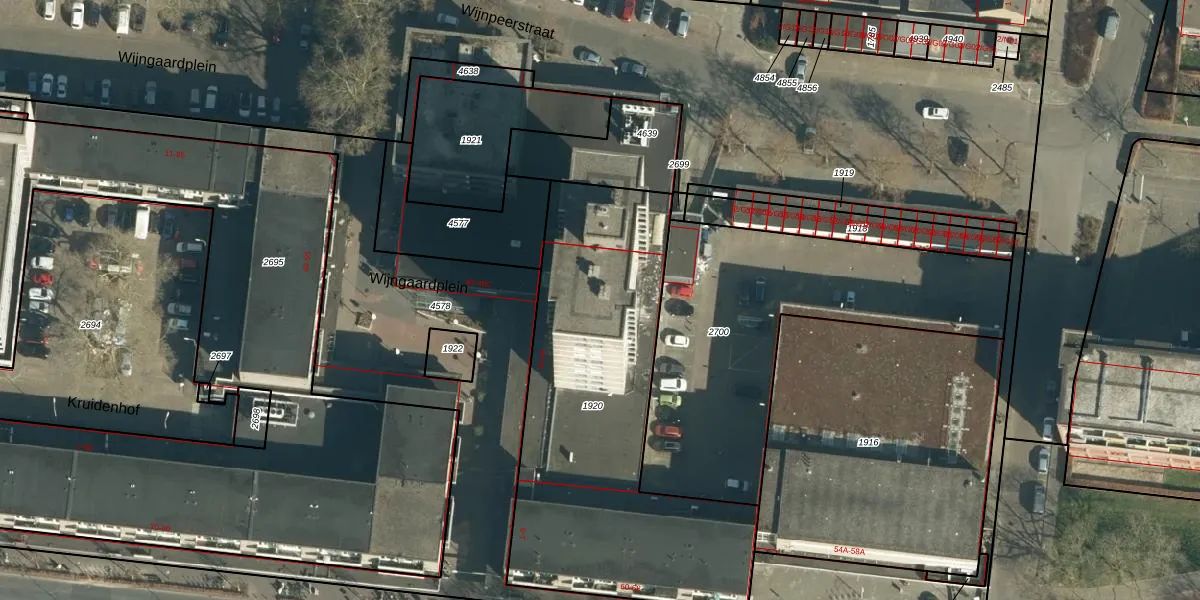 Het perceel waarop Wijngaardplein 22 staat heeft een oppervlakte van 1753 m². Dit is een zeer groot perceel. De perceeloppervlakte wordt geregistreerd door het Kadaster. Gedetailleerde informatie over de maten van dit perceel kunt u vinden in het rapport Kadastrale kaart met maatvoering van Wijngaardplein 22.