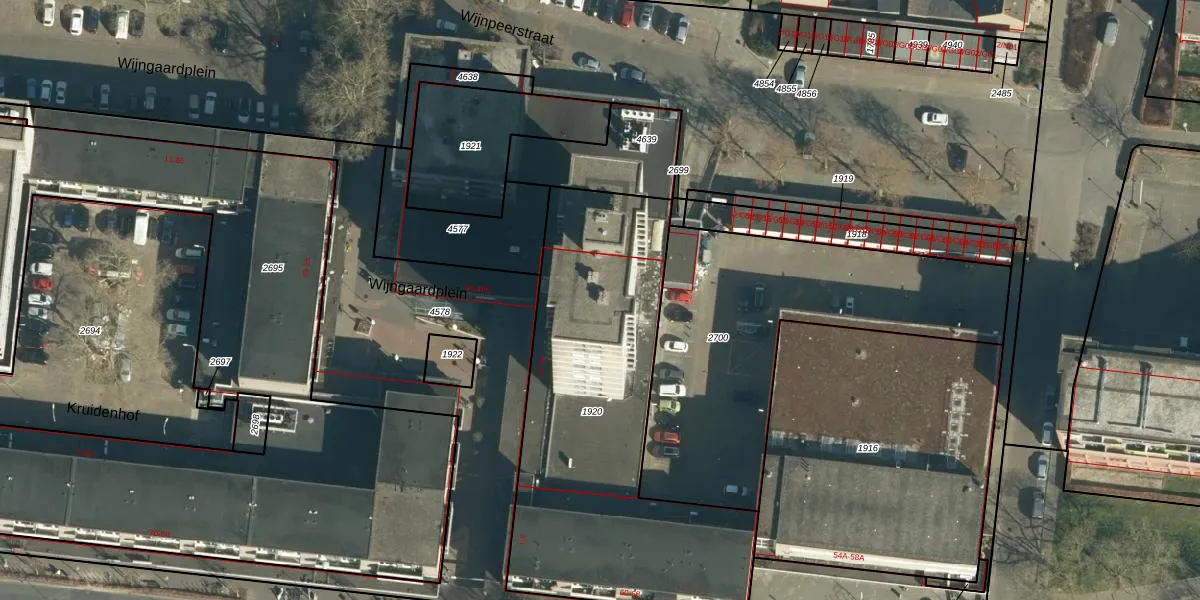Het perceel waarop Wijngaardplein 28 staat heeft een oppervlakte van 1753 m². Dit is een zeer groot perceel. De perceeloppervlakte wordt geregistreerd door het Kadaster. Gedetailleerde informatie over de maten van dit perceel kunt u vinden in het rapport Kadastrale kaart met maatvoering van Wijngaardplein 28.