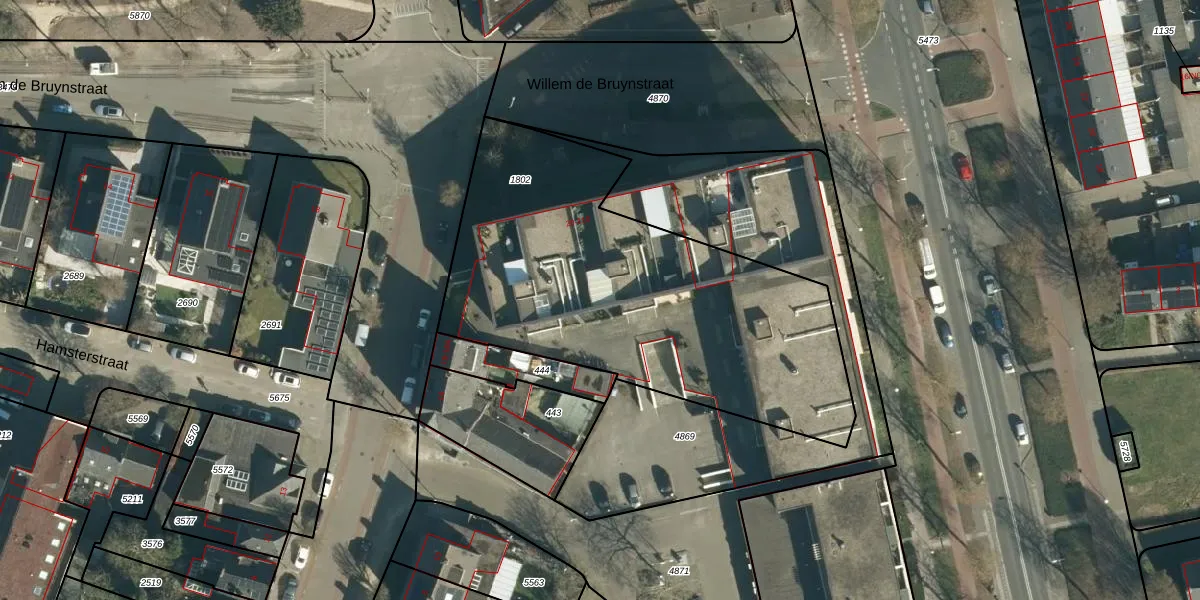 Het perceel waarop Willem de Bruynstraat 66 staat heeft een oppervlakte van 1953 m². Dit is een zeer groot perceel. De perceeloppervlakte wordt geregistreerd door het Kadaster. Gedetailleerde informatie over de maten van dit perceel kunt u vinden in het rapport Kadastrale kaart met maatvoering van Willem de Bruynstraat 66.