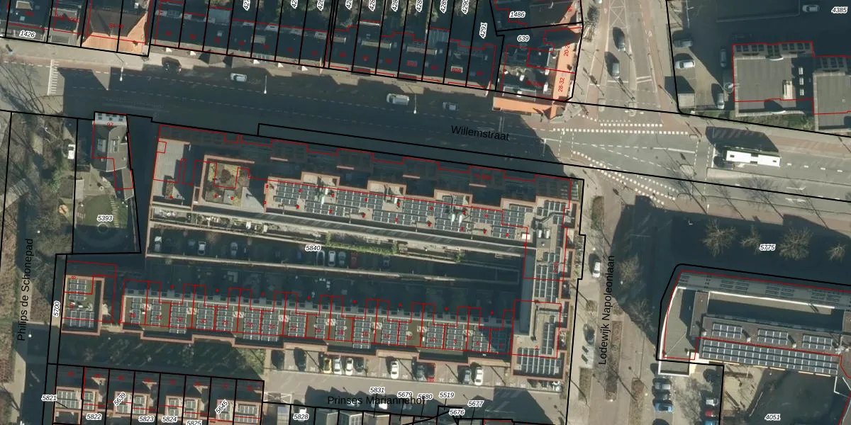 Het perceel waarop Willemstraat 93 staat heeft een oppervlakte van 6675 m². Dit is een zeer groot perceel. De perceeloppervlakte wordt geregistreerd door het Kadaster. Gedetailleerde informatie over de maten van dit perceel kunt u vinden in het rapport Kadastrale kaart met maatvoering van Willemstraat 93.