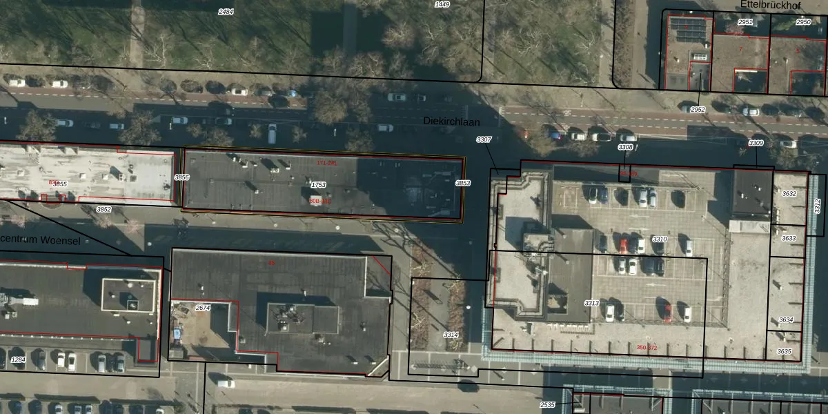 Het perceel waarop Winkelcentrum Woensel 81 staat heeft een oppervlakte van 967 m². Dit is een groot perceel. De perceeloppervlakte wordt geregistreerd door het Kadaster. Gedetailleerde informatie over de maten van dit perceel kunt u vinden in het rapport Kadastrale kaart met maatvoering van Winkelcentrum Woensel 81.