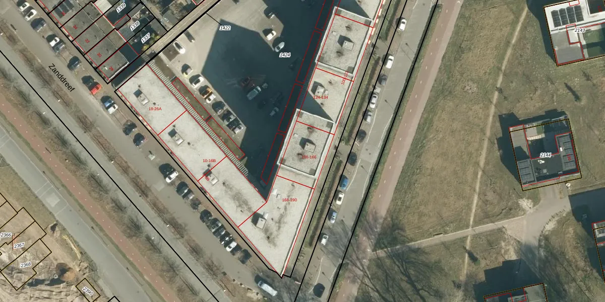Zandkasteel 142 is gelegen op kadastraal perceel STR03F1424. Deze kadastrale aanduiding is uniek en wordt gebruikt door het Kadaster om eigendomsrechten en andere zakelijke rechten vast te leggen. Het perceel maakt onderdeel uit van de kadastrale gemeente Strijp.