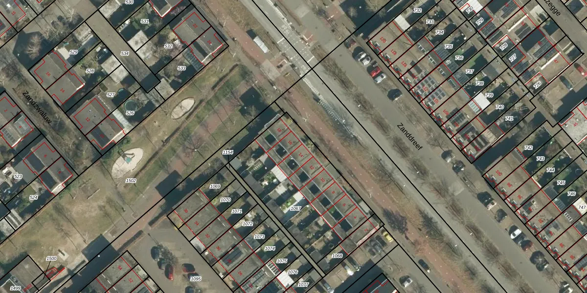 Zandroos 16 is gelegen op kadastraal perceel STR03F1067. Deze kadastrale aanduiding is uniek en wordt gebruikt door het Kadaster om eigendomsrechten en andere zakelijke rechten vast te leggen. Het perceel maakt onderdeel uit van de kadastrale gemeente Strijp.