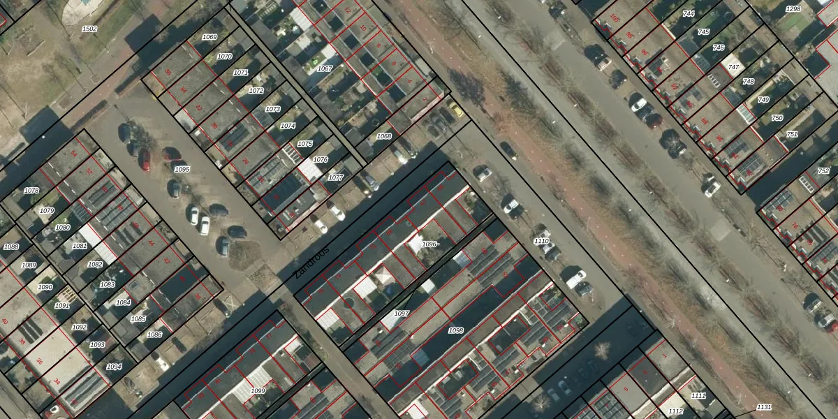 Zandroos 67 is gelegen op kadastraal perceel STR03F1096. Deze kadastrale aanduiding is uniek en wordt gebruikt door het Kadaster om eigendomsrechten en andere zakelijke rechten vast te leggen. Het perceel maakt onderdeel uit van de kadastrale gemeente Strijp.
