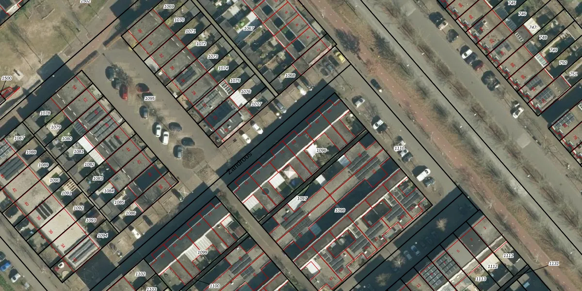 Zandroos 69 is gelegen op kadastraal perceel STR03F1096. Deze kadastrale aanduiding is uniek en wordt gebruikt door het Kadaster om eigendomsrechten en andere zakelijke rechten vast te leggen. Het perceel maakt onderdeel uit van de kadastrale gemeente Strijp.
