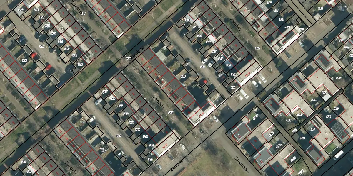 Het perceel waarop Zandvis 54 staat heeft een oppervlakte van 1006 m². Dit is een zeer groot perceel. De perceeloppervlakte wordt geregistreerd door het Kadaster. Gedetailleerde informatie over de maten van dit perceel kunt u vinden in het rapport Kadastrale kaart met maatvoering van Zandvis 54.