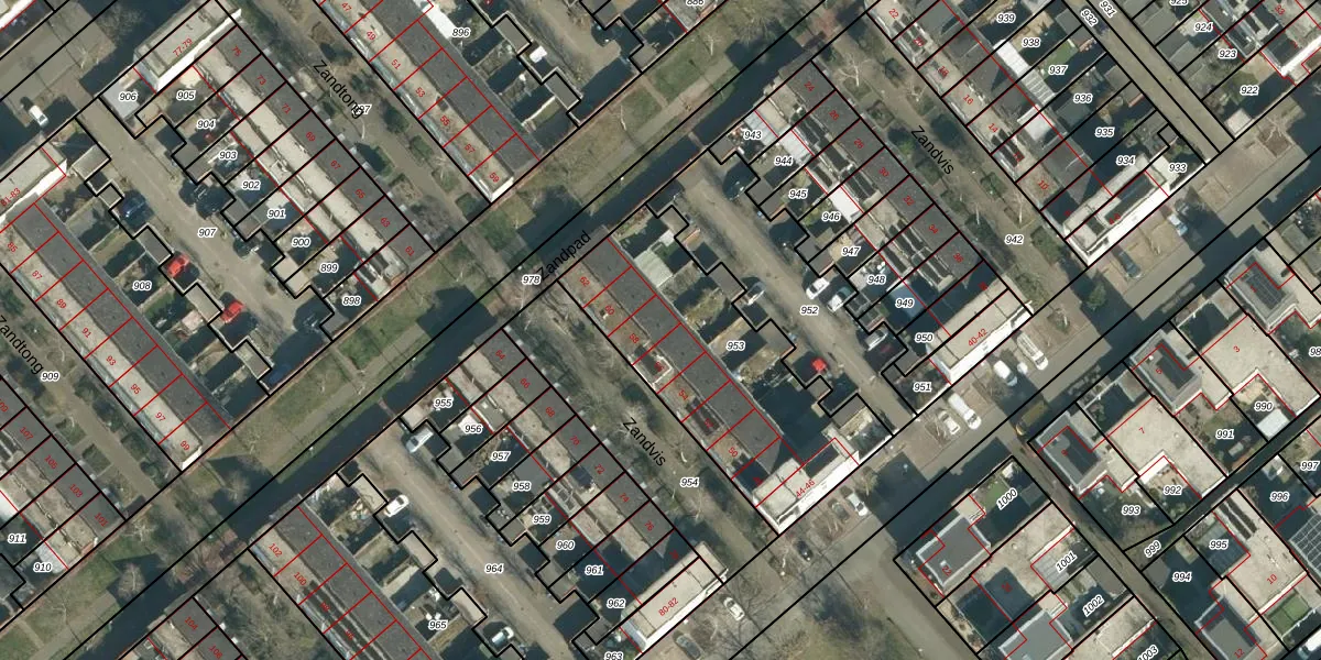 Het perceel waarop Zandvis 58 staat heeft een oppervlakte van 1006 m². Dit is een zeer groot perceel. De perceeloppervlakte wordt geregistreerd door het Kadaster. Gedetailleerde informatie over de maten van dit perceel kunt u vinden in het rapport Kadastrale kaart met maatvoering van Zandvis 58.