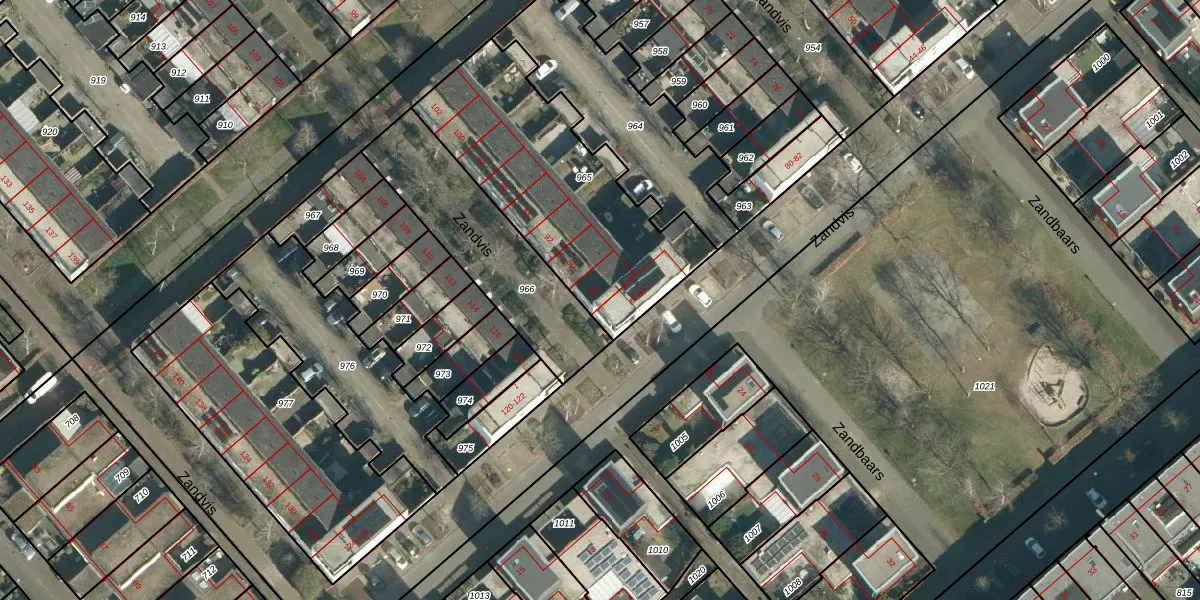 Het perceel waarop Zandvis 88 staat heeft een oppervlakte van 1012 m². Dit is een zeer groot perceel. De perceeloppervlakte wordt geregistreerd door het Kadaster. Gedetailleerde informatie over de maten van dit perceel kunt u vinden in het rapport Kadastrale kaart met maatvoering van Zandvis 88.