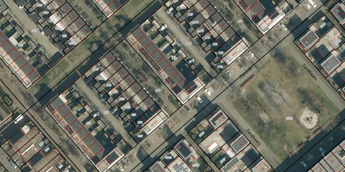 Het perceel waarop Zandvis 90 staat heeft een oppervlakte van 1012 m². Dit is een zeer groot perceel. De perceeloppervlakte wordt geregistreerd door het Kadaster. Gedetailleerde informatie over de maten van dit perceel kunt u vinden in het rapport Kadastrale kaart met maatvoering van Zandvis 90.