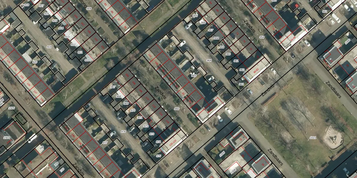 Het perceel waarop Zandvis 94 staat heeft een oppervlakte van 1012 m². Dit is een zeer groot perceel. De perceeloppervlakte wordt geregistreerd door het Kadaster. Gedetailleerde informatie over de maten van dit perceel kunt u vinden in het rapport Kadastrale kaart met maatvoering van Zandvis 94.