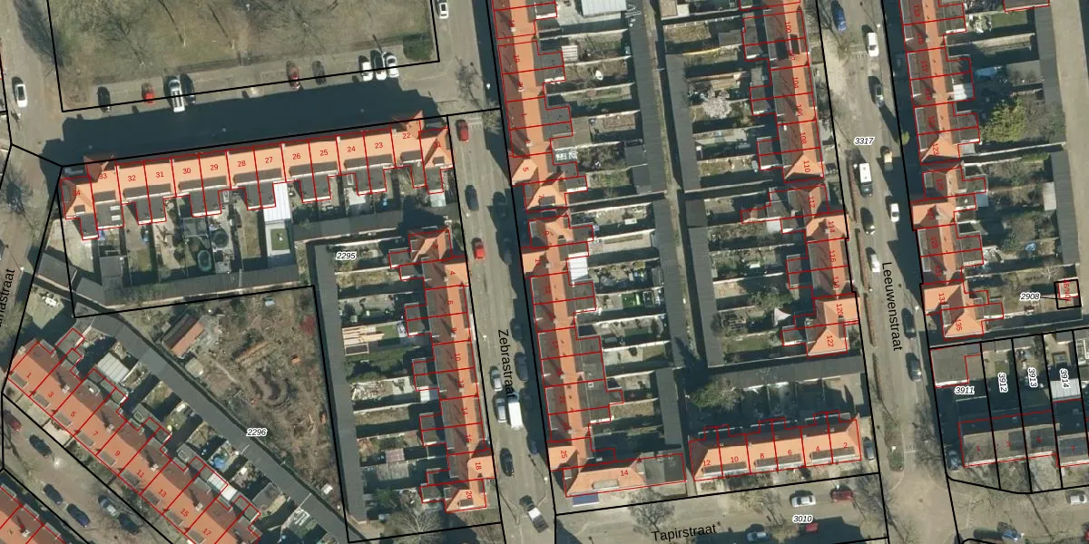 Het perceel waarop Zebrastraat 11 staat heeft een oppervlakte van 1,3 ha. Dit is een zeer groot perceel. De perceeloppervlakte wordt geregistreerd door het Kadaster. Gedetailleerde informatie over de maten van dit perceel kunt u vinden in het rapport Kadastrale kaart met maatvoering van Zebrastraat 11.