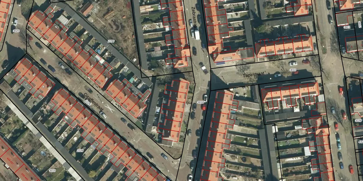 Het perceel waarop Zebrastraat 22 staat heeft een oppervlakte van 3888 m². Dit is een zeer groot perceel. De perceeloppervlakte wordt geregistreerd door het Kadaster. Gedetailleerde informatie over de maten van dit perceel kunt u vinden in het rapport Kadastrale kaart met maatvoering van Zebrastraat 22.