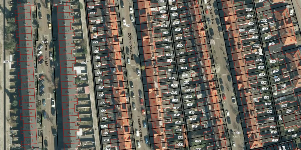 Gebruik de zoekbalk of klik op een perceel voor informatie over de adressen binnen dit perceel.