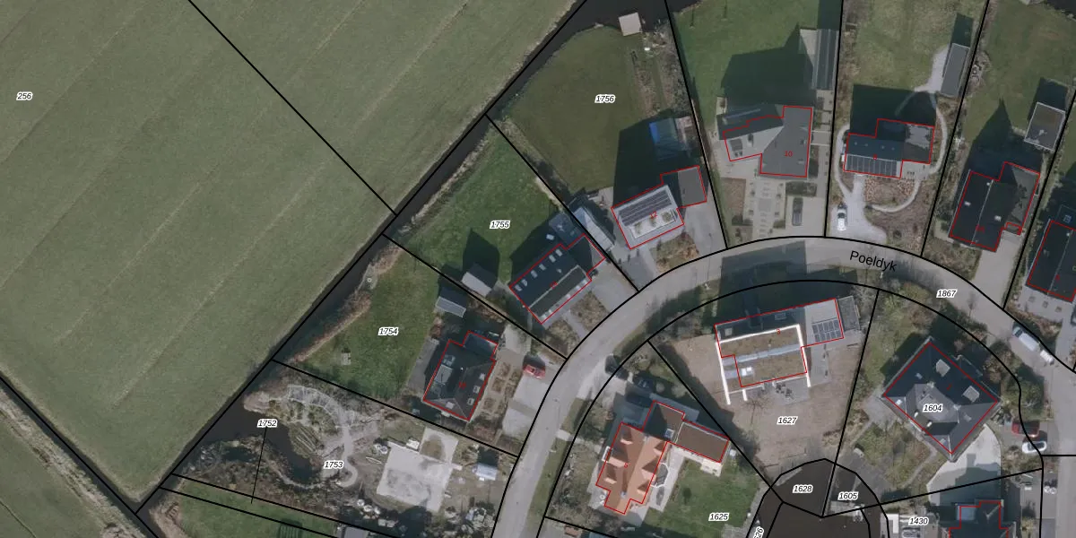 Het perceel waarop Poeldyk 14 staat heeft een oppervlakte van 1001 m². Dit is een zeer groot perceel. De perceeloppervlakte wordt geregistreerd door het Kadaster. Gedetailleerde informatie over de maten van dit perceel kunt u vinden in het rapport Kadastrale kaart met maatvoering van Poeldyk 14.
