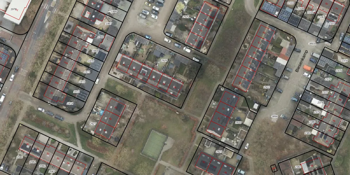 Het perceel waarop Biesenkamp 54 staat heeft een oppervlakte van 1262 m². Dit is een zeer groot perceel. De perceeloppervlakte wordt geregistreerd door het Kadaster. Gedetailleerde informatie over de maten van dit perceel kunt u vinden in het rapport Kadastrale kaart met maatvoering van Biesenkamp 54.