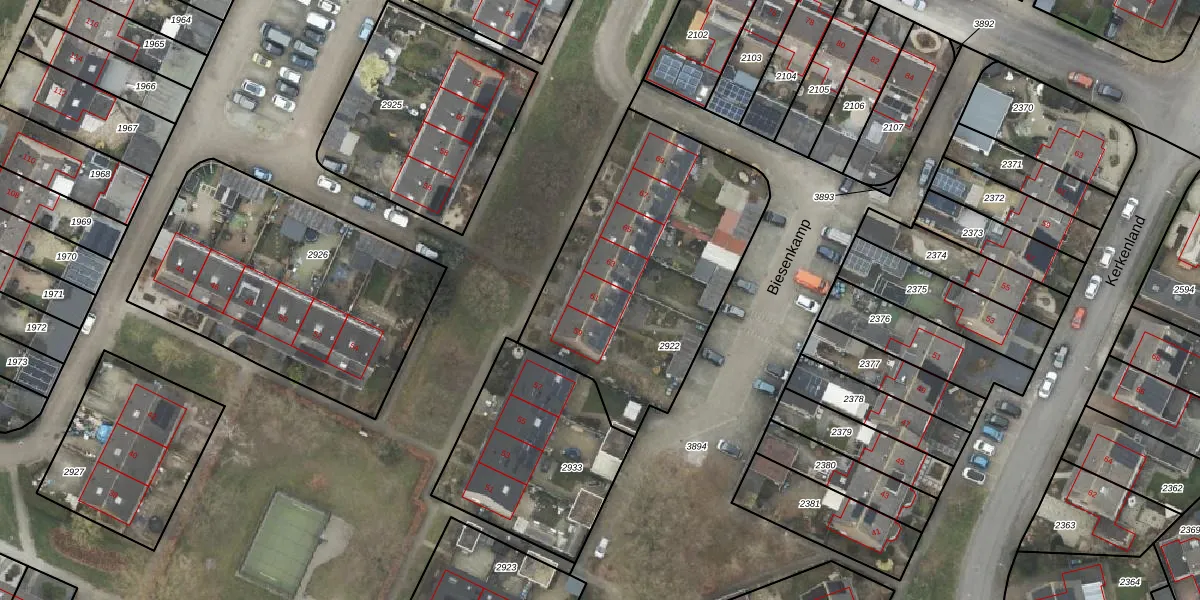 Het perceel waarop Biesenkamp 61 staat heeft een oppervlakte van 1249 m². Dit is een zeer groot perceel. De perceeloppervlakte wordt geregistreerd door het Kadaster. Gedetailleerde informatie over de maten van dit perceel kunt u vinden in het rapport Kadastrale kaart met maatvoering van Biesenkamp 61.