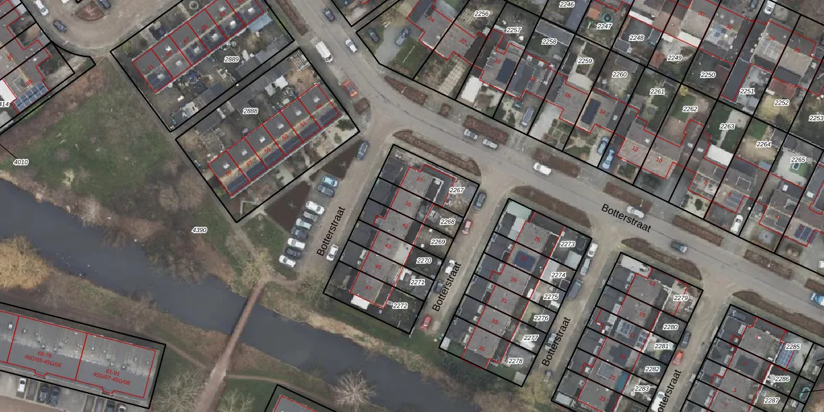 Botterstraat 39 is gelegen op kadastraal perceel EBG01A2268. Deze kadastrale aanduiding is uniek en wordt gebruikt door het Kadaster om eigendomsrechten en andere zakelijke rechten vast te leggen. Het perceel maakt onderdeel uit van de kadastrale gemeente Elburg.