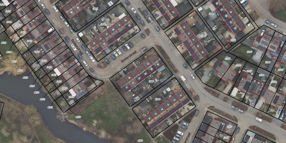 Het perceel waarop Botterstraat 65 staat heeft een oppervlakte van 903 m². Dit is een groot perceel. De perceeloppervlakte wordt geregistreerd door het Kadaster. Gedetailleerde informatie over de maten van dit perceel kunt u vinden in het rapport Kadastrale kaart met maatvoering van Botterstraat 65.