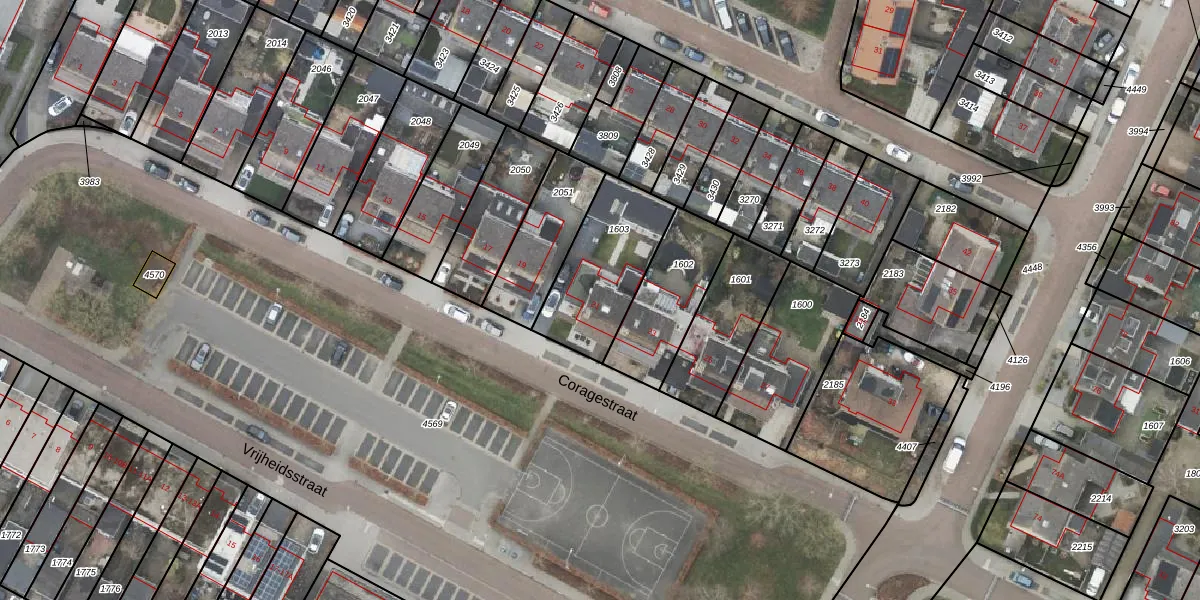 Het perceel waarop Coragestraat 21 staat heeft een oppervlakte van 380 m². Dit is een groot perceel. De perceeloppervlakte wordt geregistreerd door het Kadaster. Gedetailleerde informatie over de maten van dit perceel kunt u vinden in het rapport Kadastrale kaart met maatvoering van Coragestraat 21.