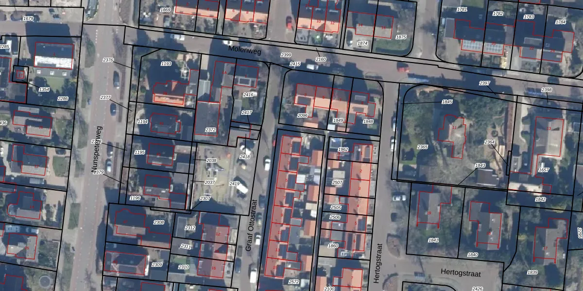 Het perceel waarop Graaf Ottostraat 1 staat heeft een oppervlakte van 1030 m². Dit is een zeer groot perceel. De perceeloppervlakte wordt geregistreerd door het Kadaster. Gedetailleerde informatie over de maten van dit perceel kunt u vinden in het rapport Kadastrale kaart met maatvoering van Graaf Ottostraat 1.