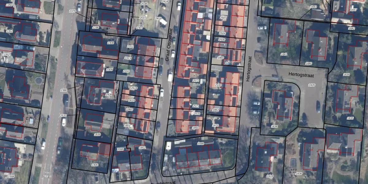Het perceel waarop Graaf Ottostraat 17 staat heeft een oppervlakte van 1030 m². Dit is een zeer groot perceel. De perceeloppervlakte wordt geregistreerd door het Kadaster. Gedetailleerde informatie over de maten van dit perceel kunt u vinden in het rapport Kadastrale kaart met maatvoering van Graaf Ottostraat 17.