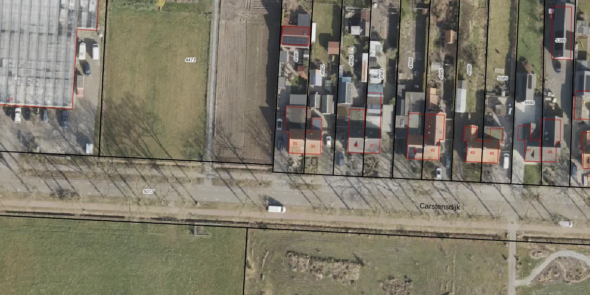 Het perceel waarop Carstensdijk 31 staat heeft een oppervlakte van 810 m². Dit is een groot perceel. De perceeloppervlakte wordt geregistreerd door het Kadaster. Gedetailleerde informatie over de maten van dit perceel kunt u vinden in het rapport Kadastrale kaart met maatvoering van Carstensdijk 31.