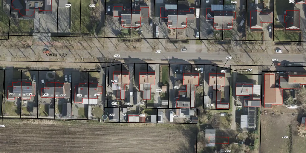 Het perceel waarop Carstensdijk 42 staat heeft een oppervlakte van 395 m². Dit is een groot perceel. De perceeloppervlakte wordt geregistreerd door het Kadaster. Gedetailleerde informatie over de maten van dit perceel kunt u vinden in het rapport Kadastrale kaart met maatvoering van Carstensdijk 42.
