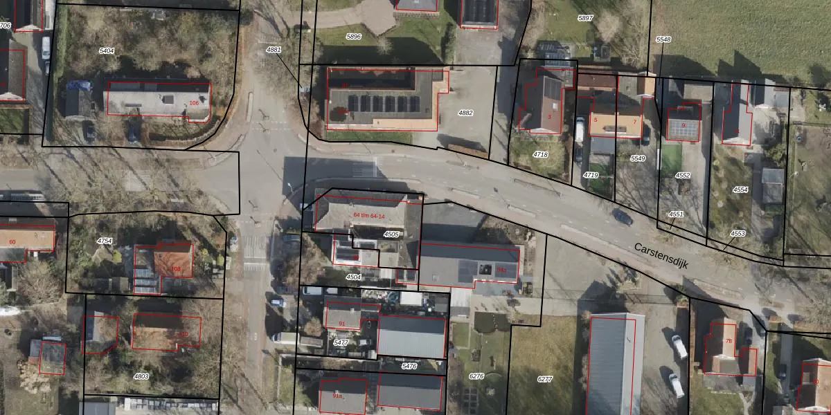 Het perceel waarop Carstensdijk 64 staat heeft een oppervlakte van 396 m². Dit is een groot perceel. De perceeloppervlakte wordt geregistreerd door het Kadaster. Gedetailleerde informatie over de maten van dit perceel kunt u vinden in het rapport Kadastrale kaart met maatvoering van Carstensdijk 64.